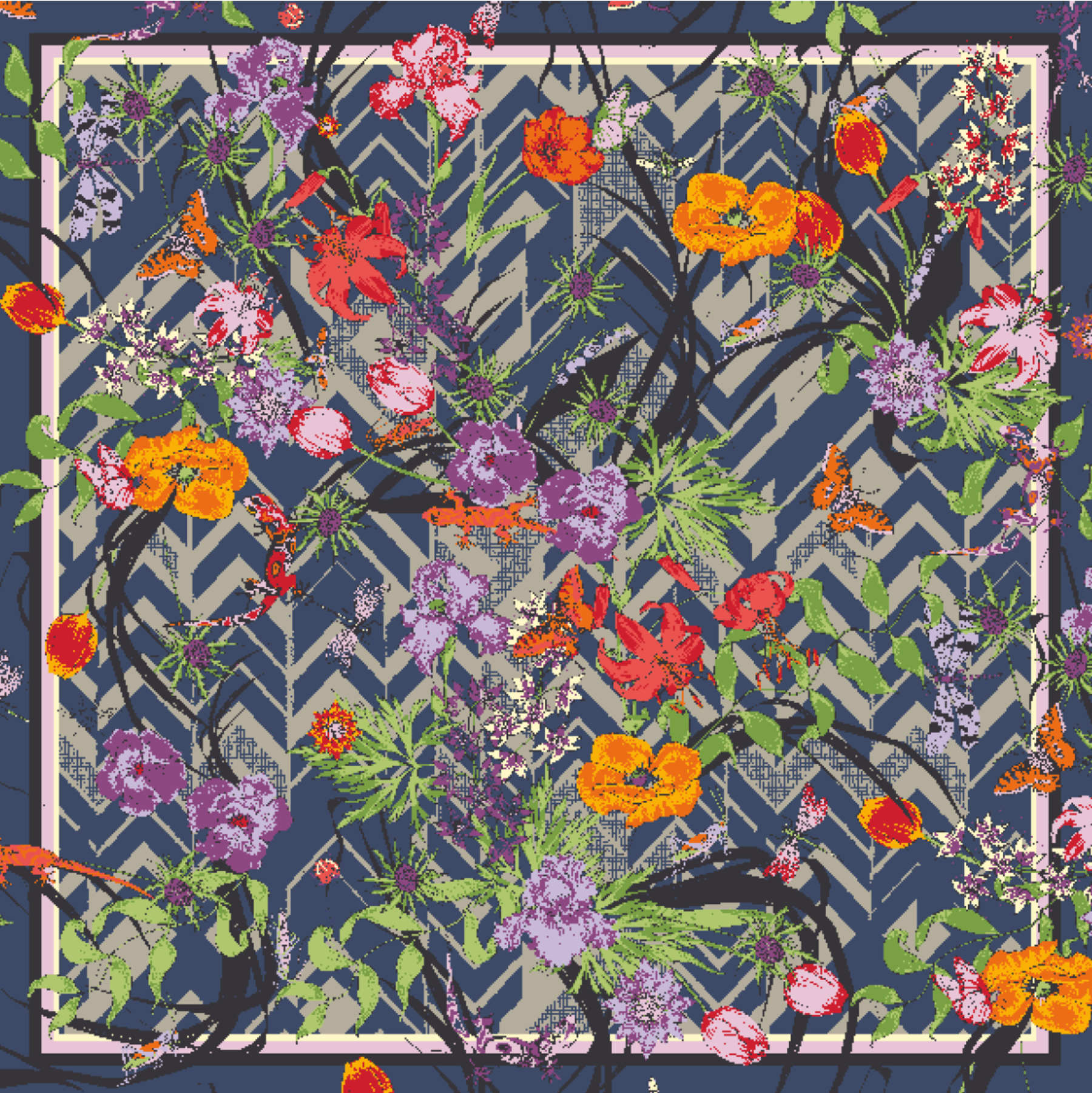 Wunderschöner Seidenschal mit Blumenmotiv und Zickzack am unteren Rand. Handgenähte Rollkanten.